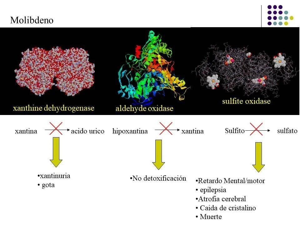 En humanos, solo 4 enzimas que requieren molibdeno se han identificado hasta la fecha: sulfito oxidasa, xantina oxidasa, aldehído oxidasa y componente reductor de amidoxima mitocondrial (mARC).